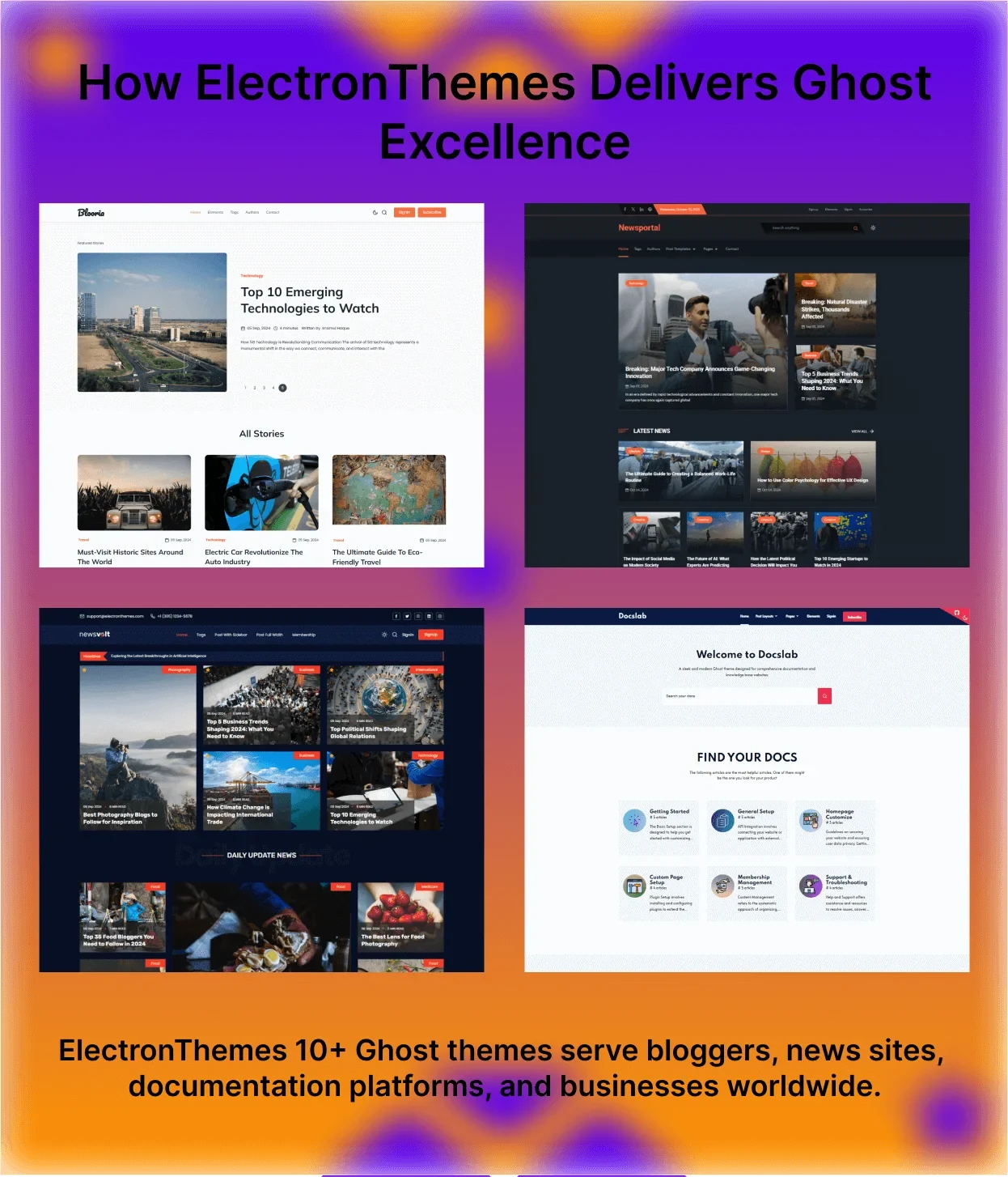 Our portfolio spans 10+ Ghost themes across all niches. NewsVolt dominates news websites beautifully. DocsLab revolutionized documentation on Ghost completely. Every theme solves real problems for creators. Check out our best Ghost blog themes showcase or explore 16 best Ghost themes for a blog.