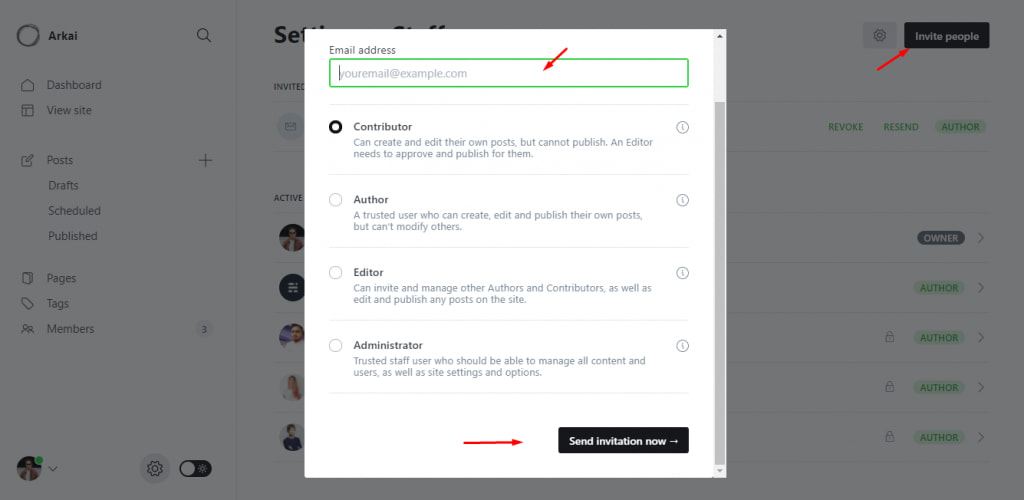 Click on Invite people and you will get a new popup. You have to add Email Address and select the staff Role. Lastly click on Send Invitation now button. An email notification will be sent to create an account on the specific Role.