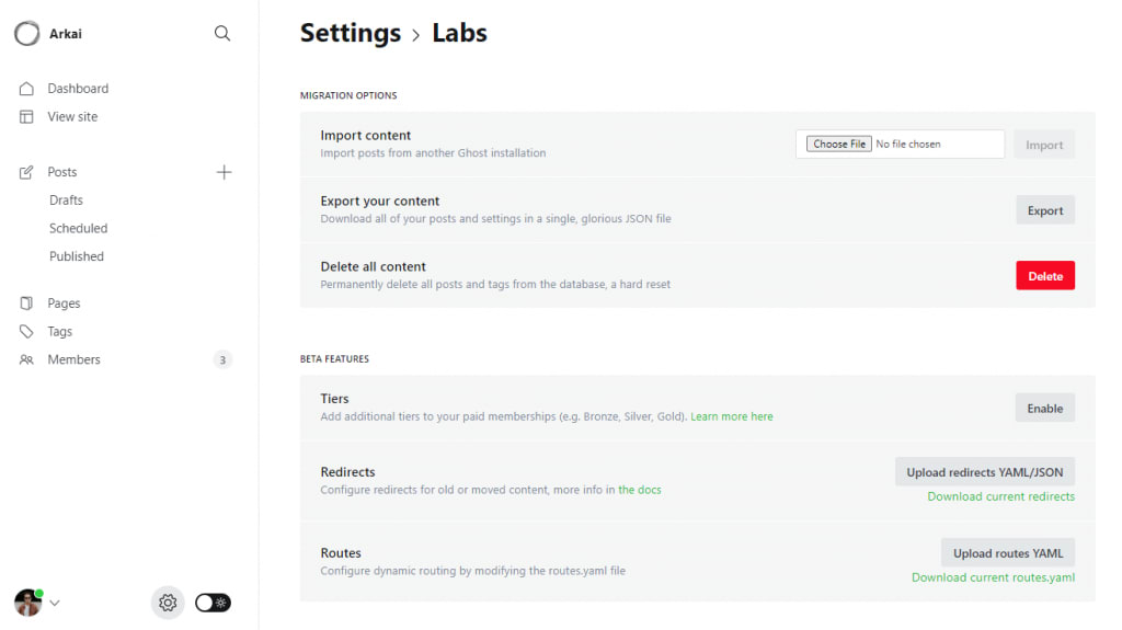 Labs is another very important and beta tester parts of Ghost. Here your will get some core features as follows: Go to Dashboard > Settings Icon > Labs