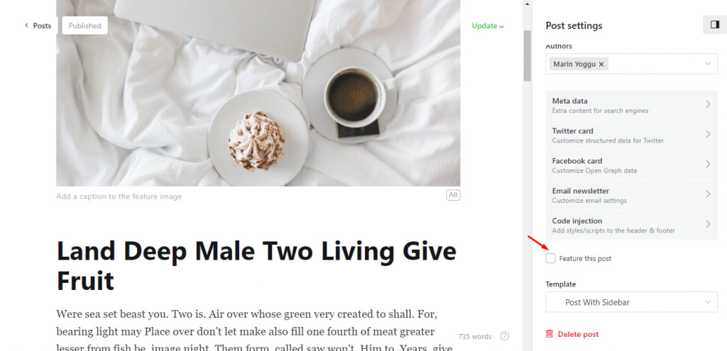 Ghost has awesome featured posts option to show some of your chosen posts as featured for the visitors. To add a post as featured, go to Post > Settings and scroll down. Select the checkbox Feature this post