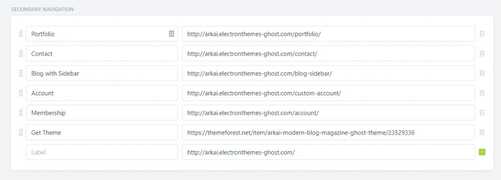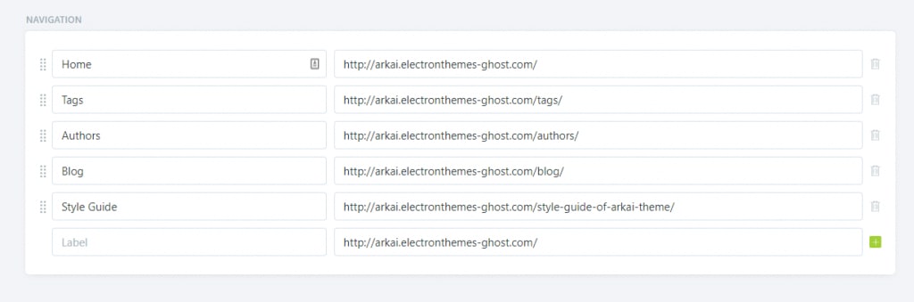 Ghost only supports two types of Navigation. Primary and Secondary Navigation Menu. On header, primary navigation is showing and On Footer secondary navigation is showing. Go to Dashboard > Settings Icon > Navigation