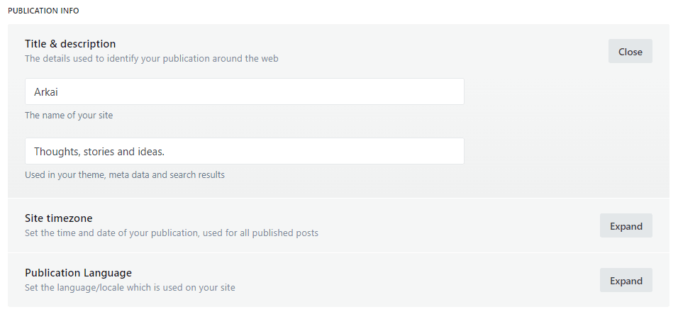 To change publication info, go to Dashboard > Settings Icon > General > Publication Info. Here you can change the followings: