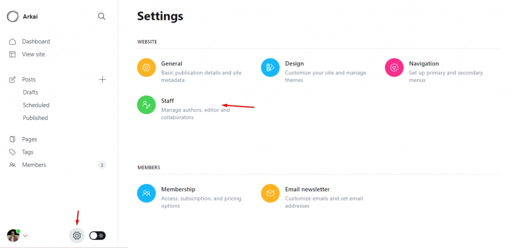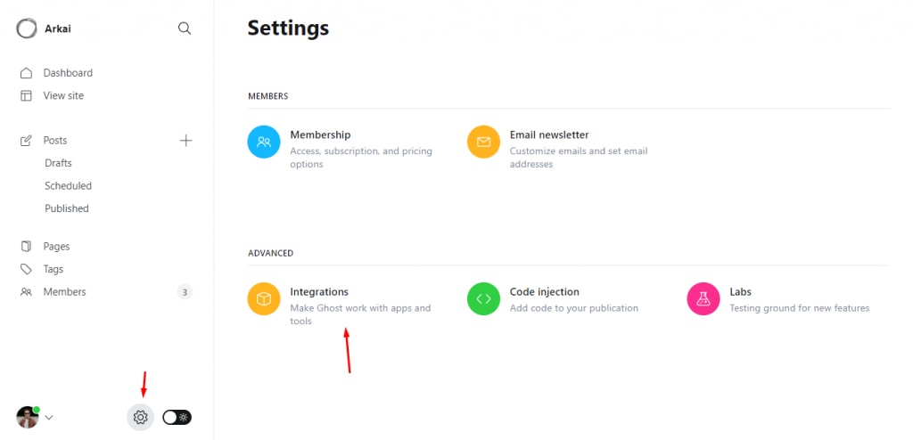 Integrations are another cool feature of Ghost. You can connect a lot of third-party plugins or API using integrations. To check the integrations, go to Dashboard > Settings Icon > Integrations. You will get some inbuilt integrations and custom integrations options