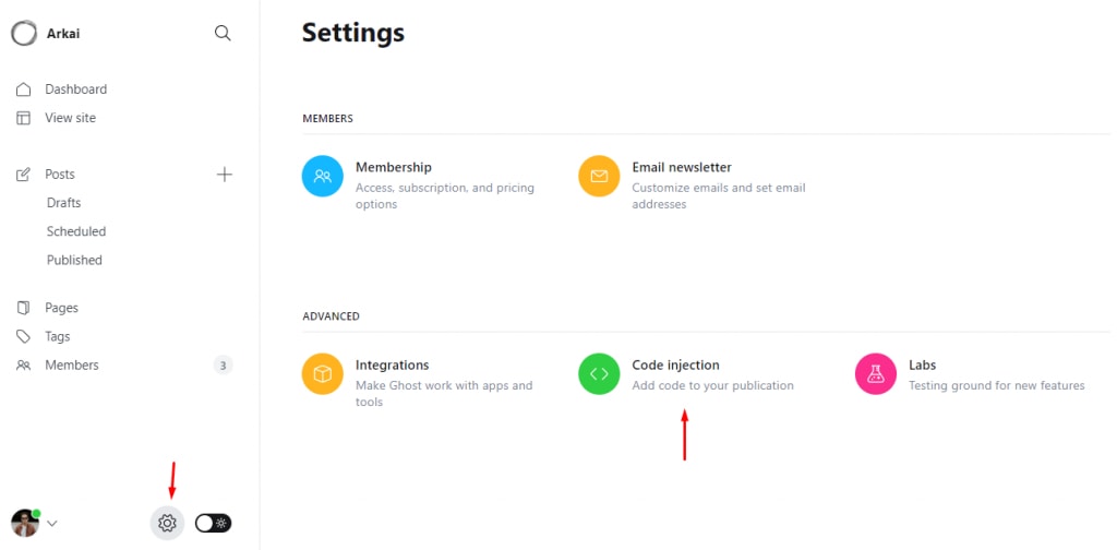 Code injection is a great feature on Ghost. You can easily write styles and scripts for your site without editing the theme file. You can add various plugins code here like Google analytics