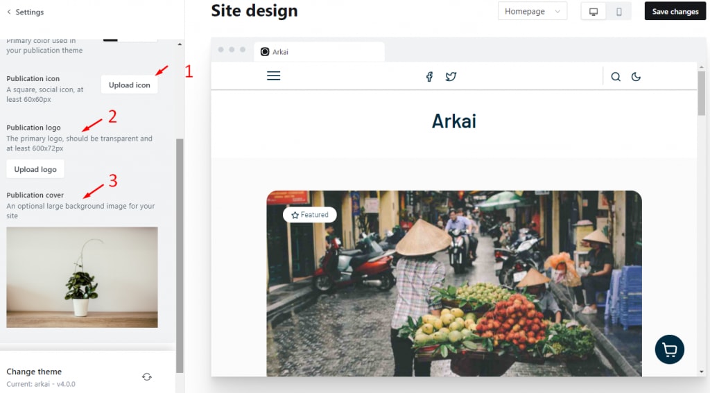 You can change Logo from Dashboard > Settings Icon > Design > Publication Identity