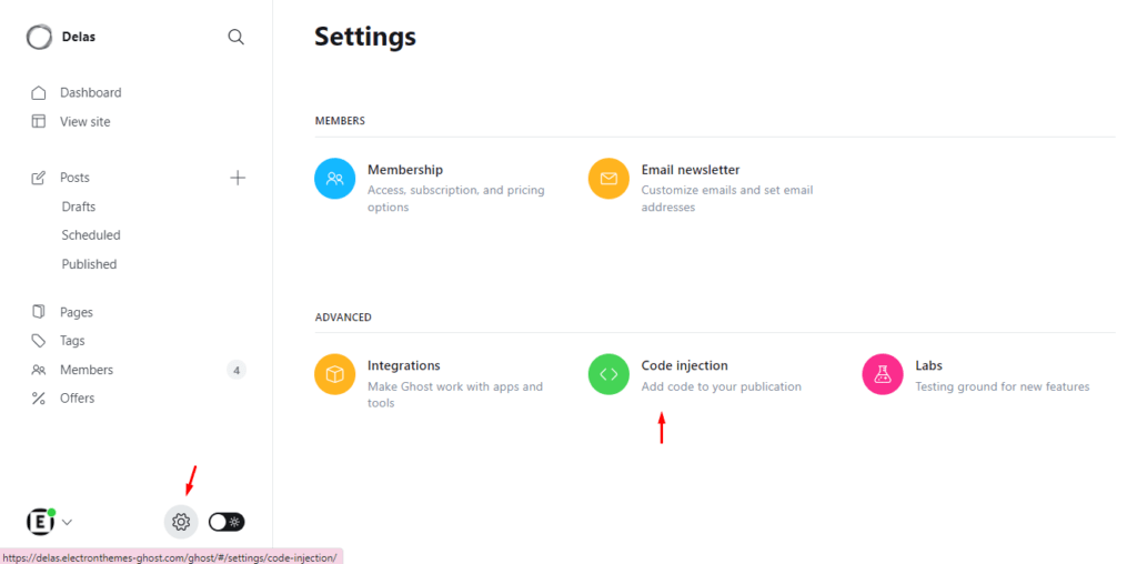 Code injection is a great feature on Ghost. You can easily write styles and scripts for your site without editing the theme file. You can add various plugins code here like Google Analytics