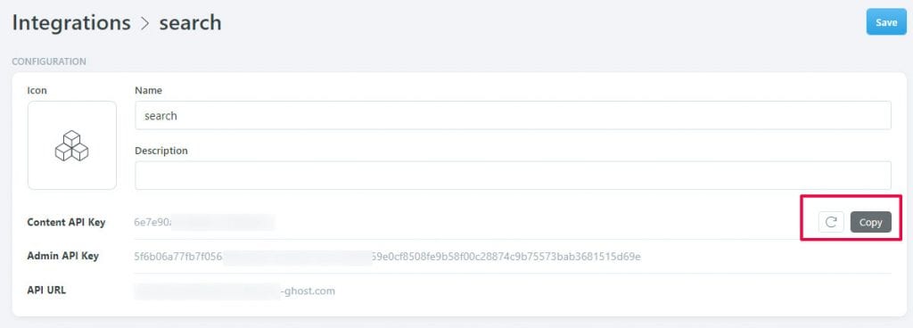 and add a name for creating integration - You can use Content API Key or Admin API Key or API URL