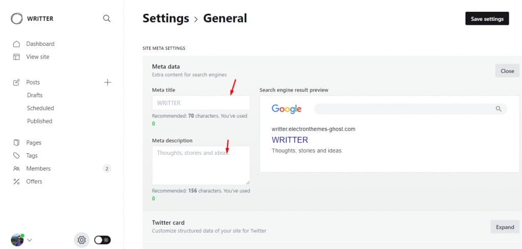 - Go to settings (general) and select theme “Writter“