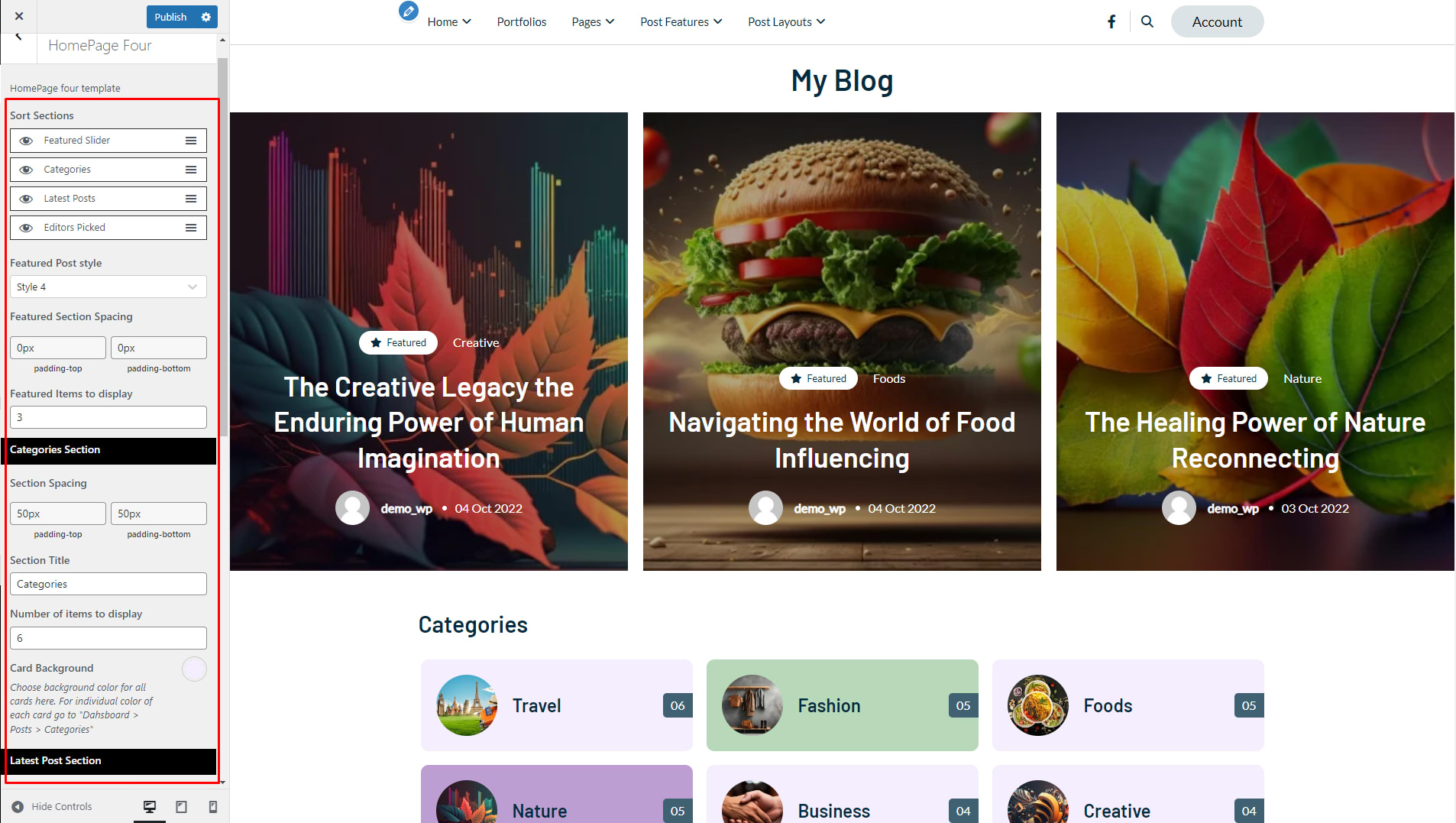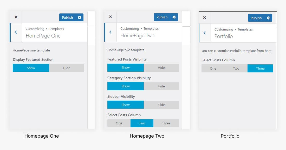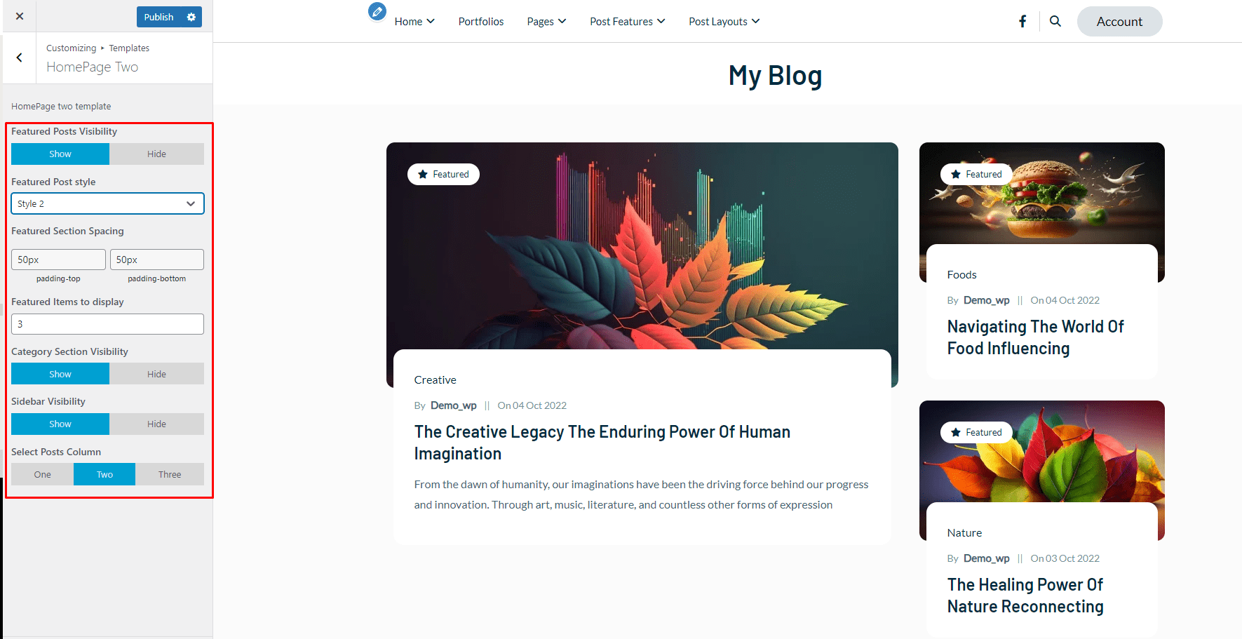 - Click on HomePage Two if you want to show or hide Featured Posts, Category Sections, and Sidebar. You can Select the post column(One, Two, Three).