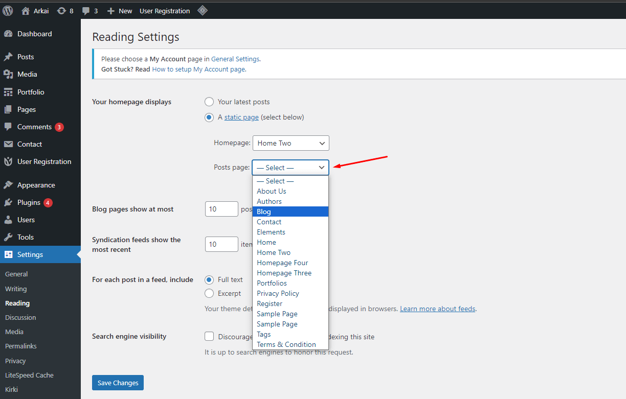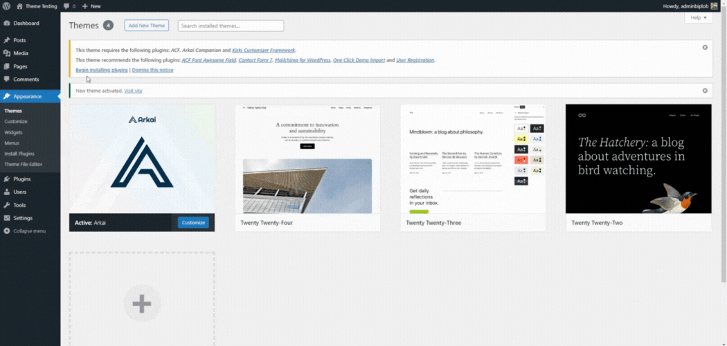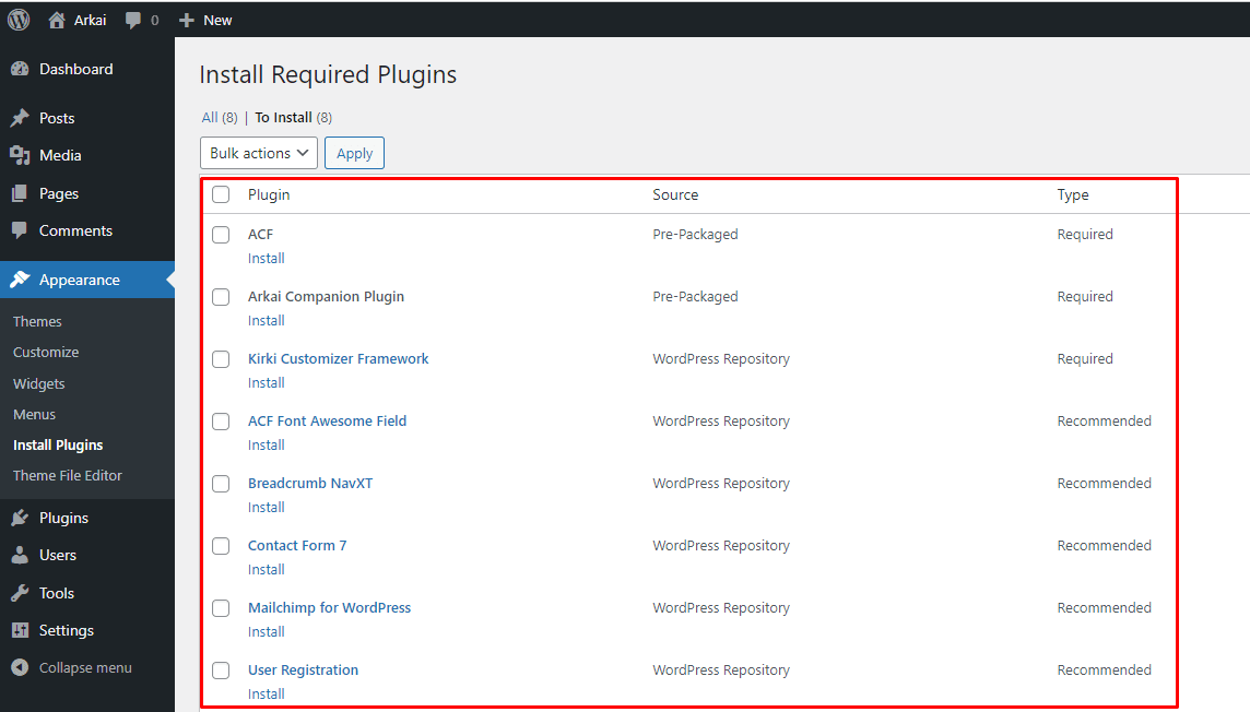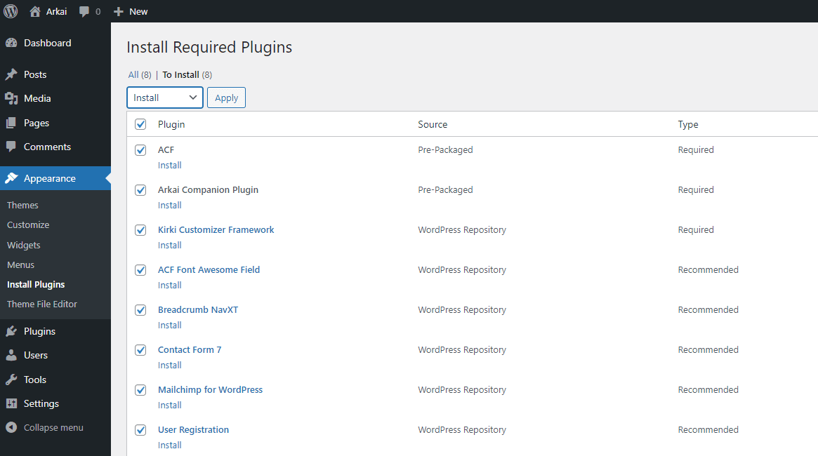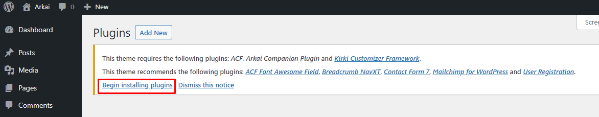 After installing the Arkai theme, the theme shows a message to Begin Installing Plugins. Follow the instructions to install and activate them.