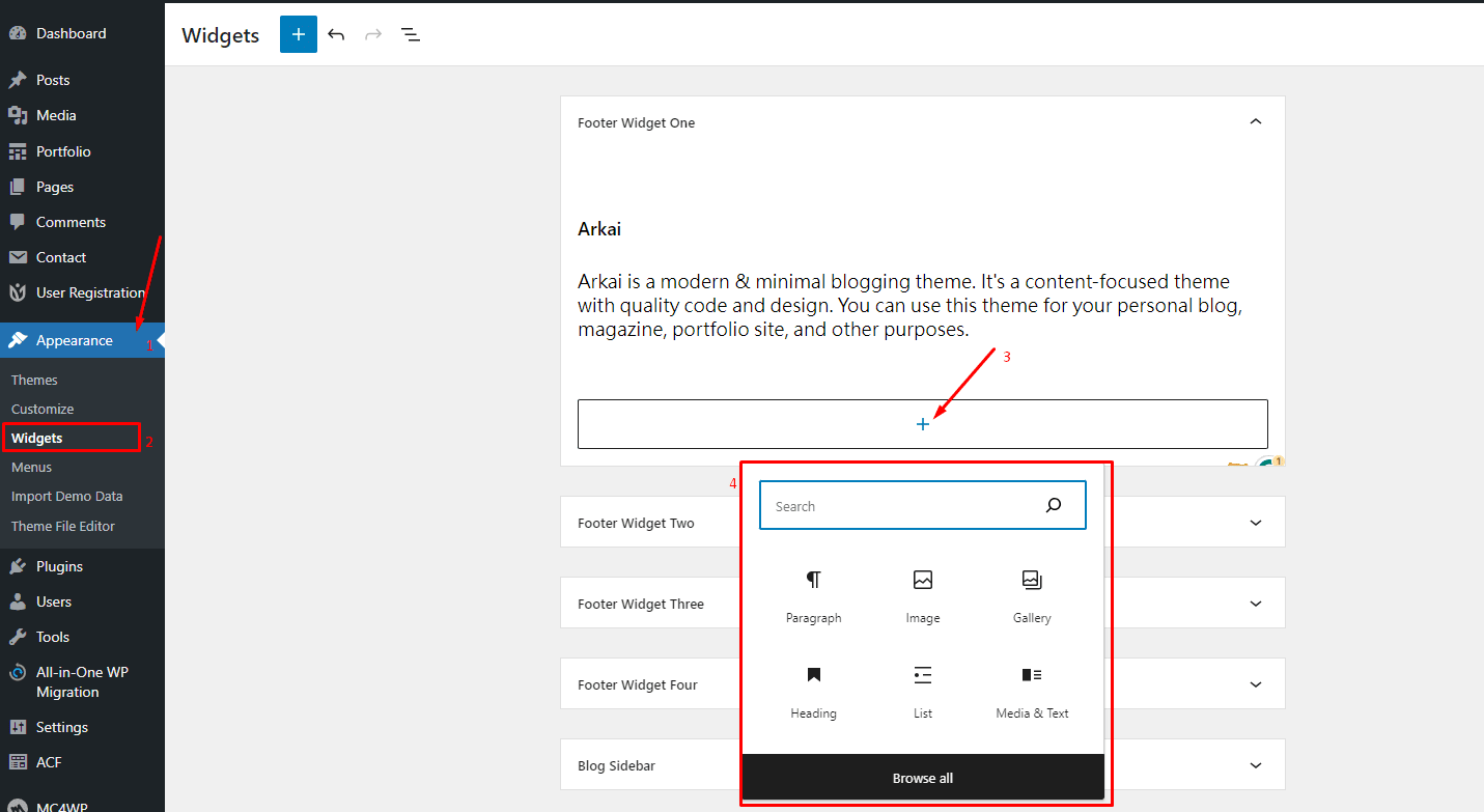 We have developed custom widgets and widget areas in the theme. Widgets are easy to manage and can be incredibly useful to have on your site. Arkai theme has 4 Footer Top widget areas, Blog sidebar area. You can add here any widget from the widgets List