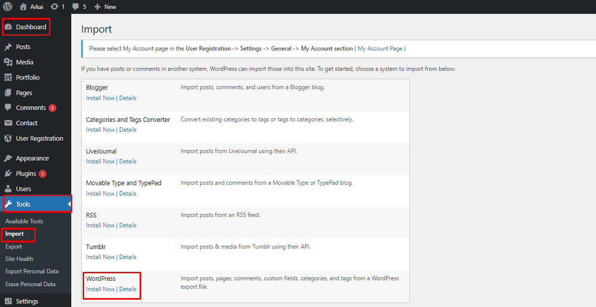 Dashboard > Tools > Import
