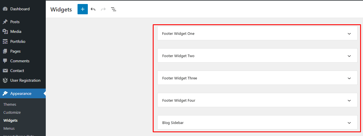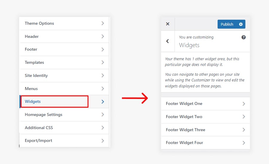 - Footer Top Area 1, 2, 3 & 4 – You can use these widget areas to add widgets to the Footer Top columns.
