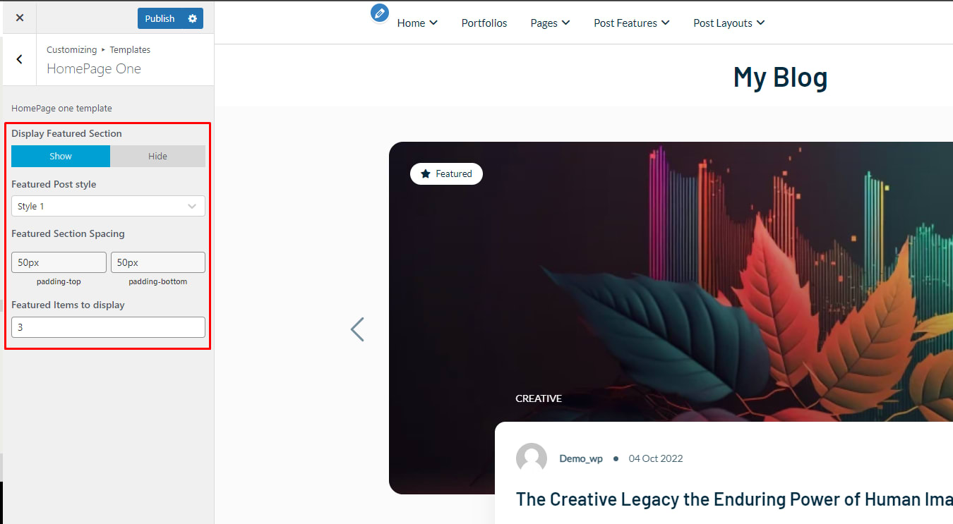 - Click on HomePage One if you want to show or hide the Display Feature Section