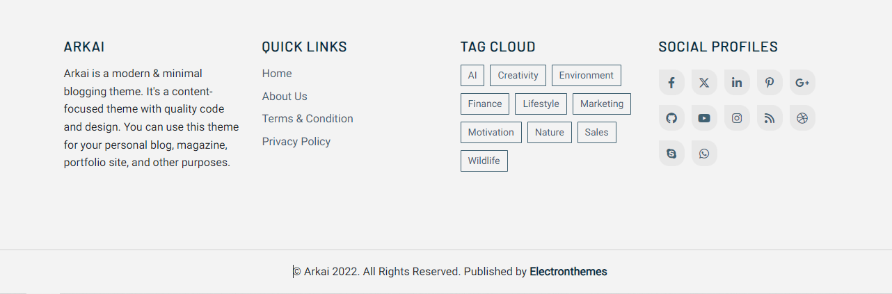 We used a minimal footer in our theme. Here are the following parts: