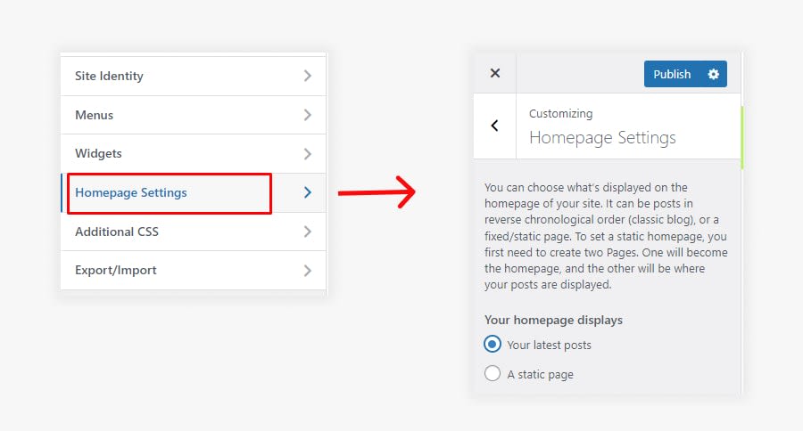 You can choose what’s displayed on the homepage of your site. It can be posts in reverse chronological order (classic blog), or a fixed/static page. To set a static homepage, you first need to create two Pages. One will become the homepage, and the other will be where your posts are displayed.